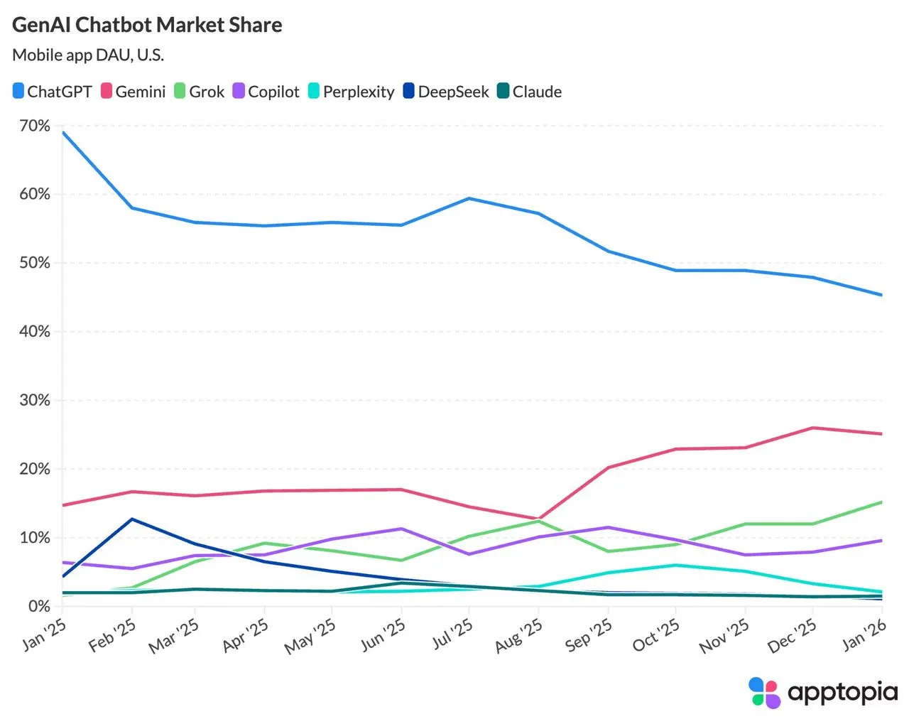 Trots att ChatGPT fortfarande är den mest använda AI-chattbotten bland amerikanska användare, visar färsk statistik att försprånget krymper snabbt. En sammanställning av data från analysföretagen AppTopia och SimilarWeb visar att ChatGPT:s marknadsandel har minskat kraftigt under det senaste året.