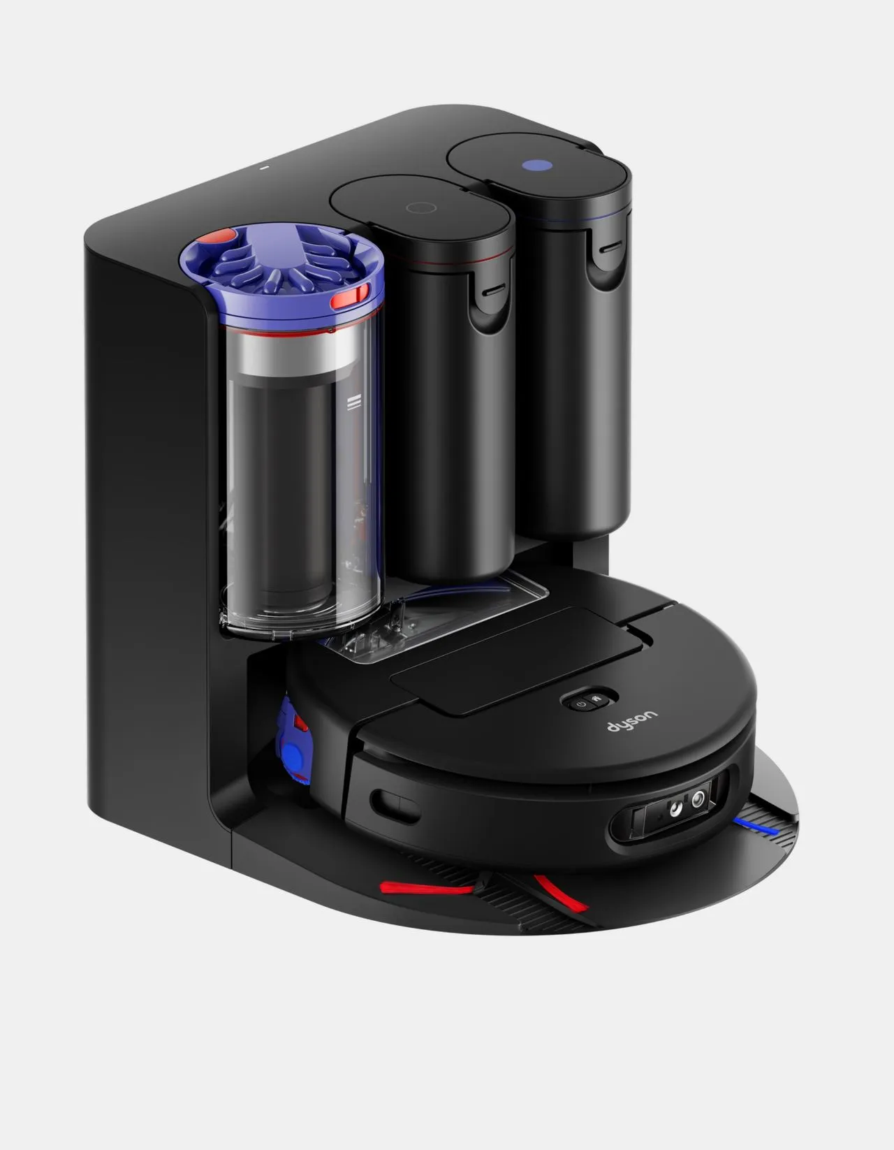 Den tillhörande dockningsstationen, kallad ”Hygienic Cyclone Dock”, fungerar som en komplett servicestation för roboten. Istället för traditionella dammsugarpåsar används Dysons cyklonteknik för att tömma enheten på torrt skräp, vilket bibehåller optimal sugkraft över tid. Systemet kan lagra smuts i upp till 100 dagar innan manuell tömning krävs.