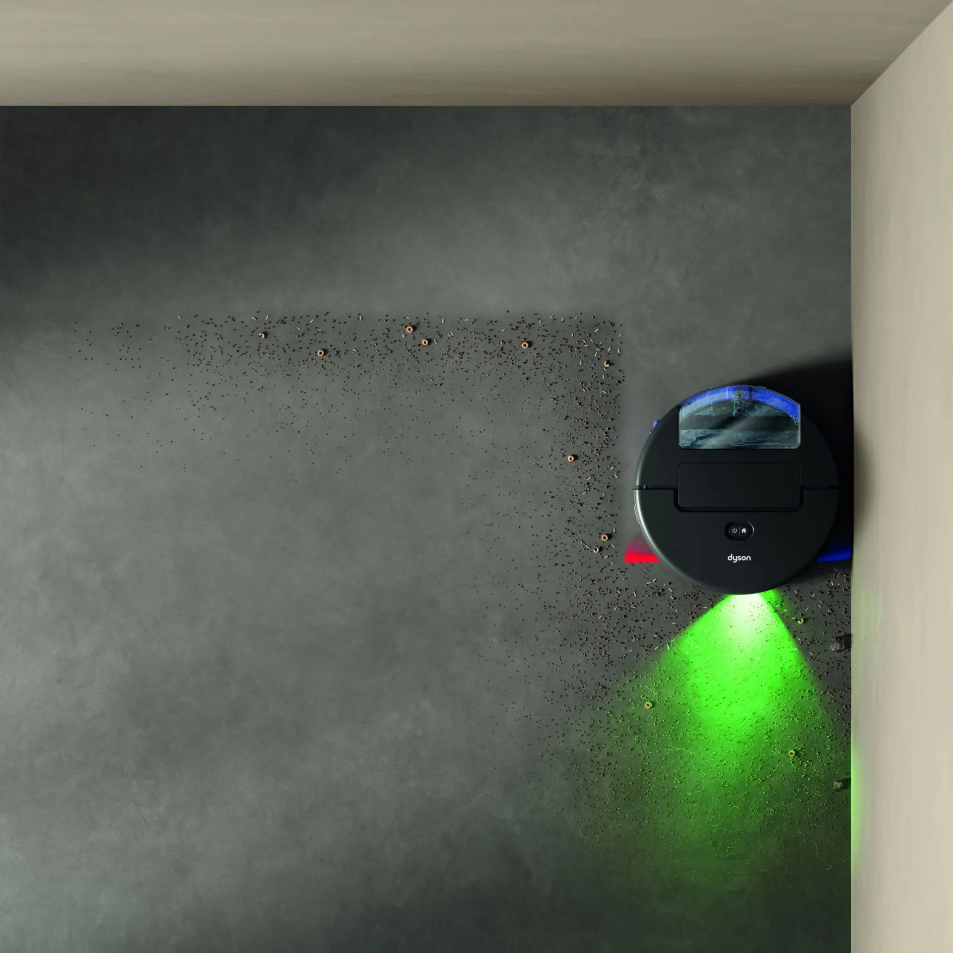 En av de mest framträdande funktionerna är det gröna kontrastljuset. Genom att projicera ljus i en specifik vinkel synliggörs dammpartiklar och fläckar som annars är osynliga för det mänskliga ögat. När smutsen har identifierats aktiveras maskinens ”wet roller”-munstycke.