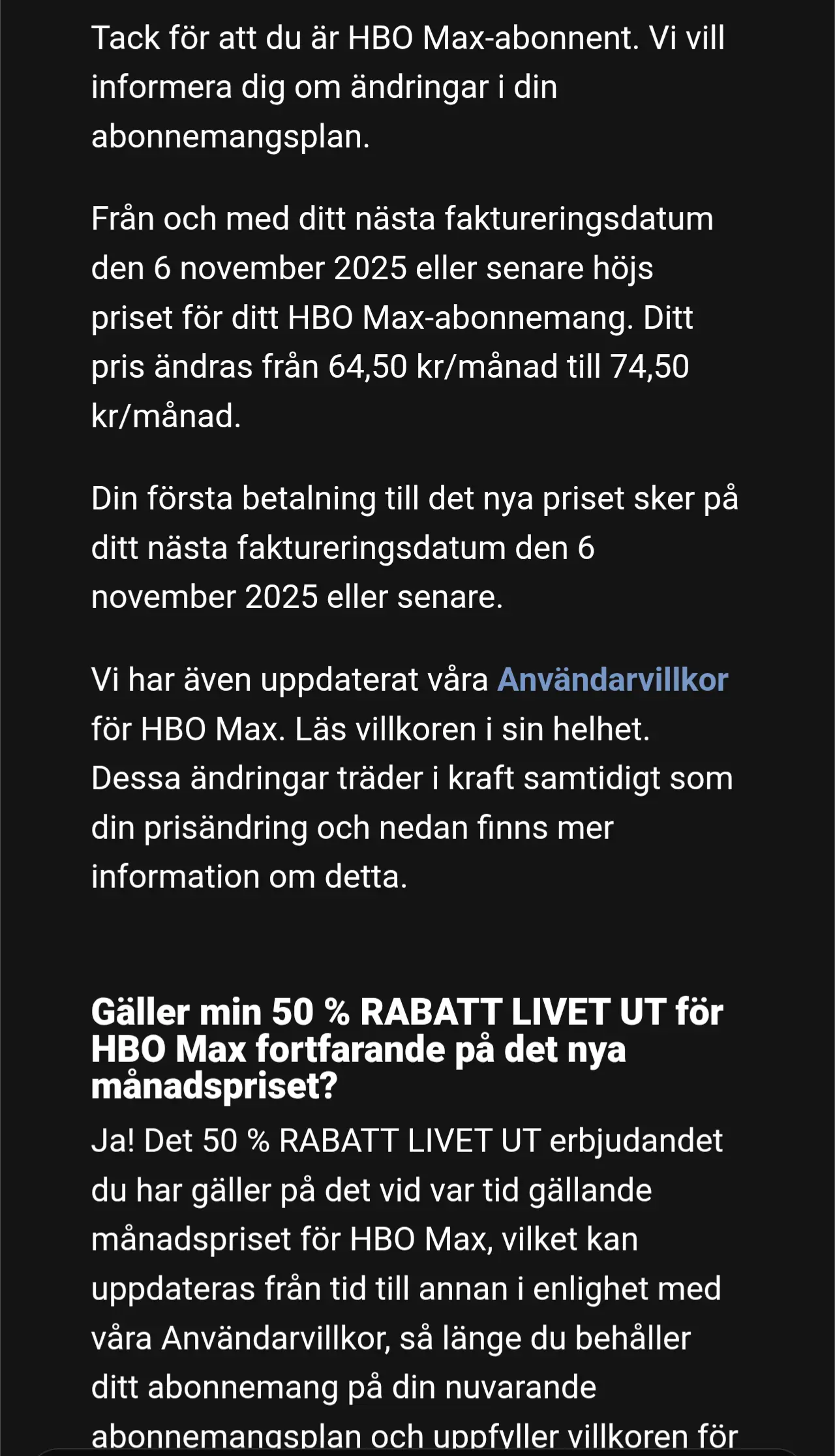 När HBO Max lanserades i Sverige erbjöds vissa användare en så kallad livstidsrabatt. Den rabatten finns fortfarande kvar, men priset justeras även här. För dem som behållit sin rabatt på standardnivån och inte flyttat över den till premiumalternativet blir det nya priset 74,50 kronor per månad.
