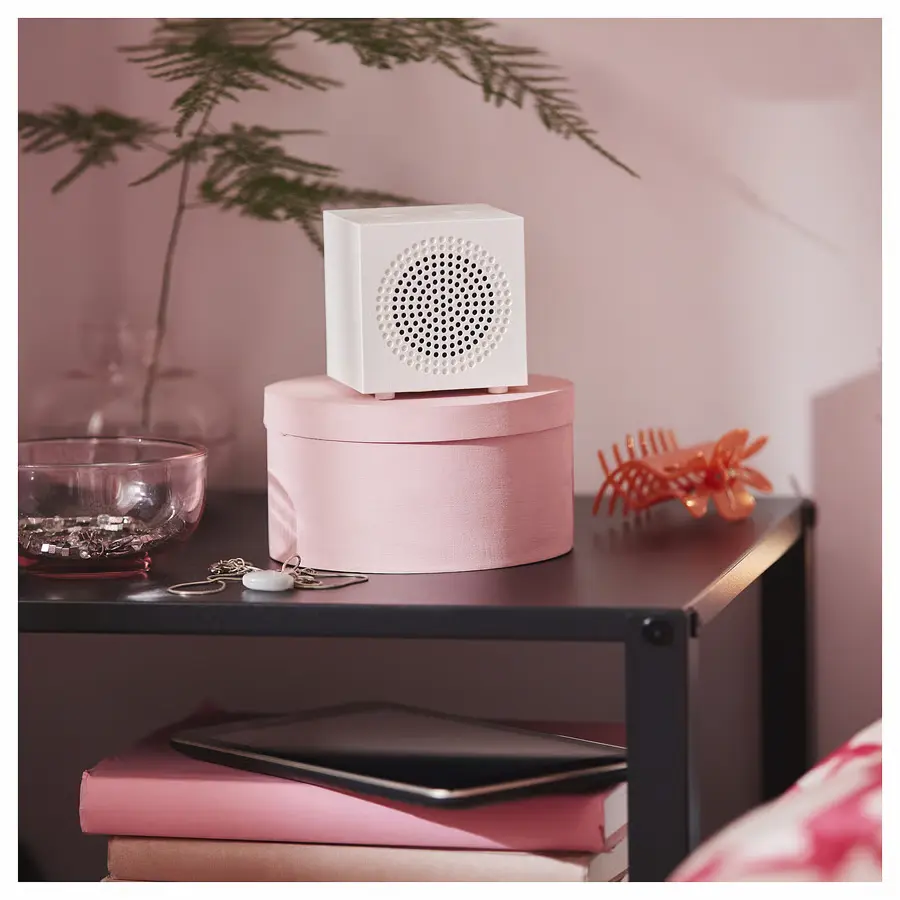 Formfaktorn på Ikea Kallsup är utpräglat kompakt och kubistisk. Med måtten 7 x 7 x 7,4 centimeter är enheten utformad för att vara enkel att placera i allt från bokhyllor till skrivbordsmiljöer, eller för att tas med på resan. För att möta olika personliga stilar har företaget valt att erbjuda högtalaren i tre specifika färgutföranden: klassiskt vitt, dovt grönt och en mer iögonfallande rosa nyans.