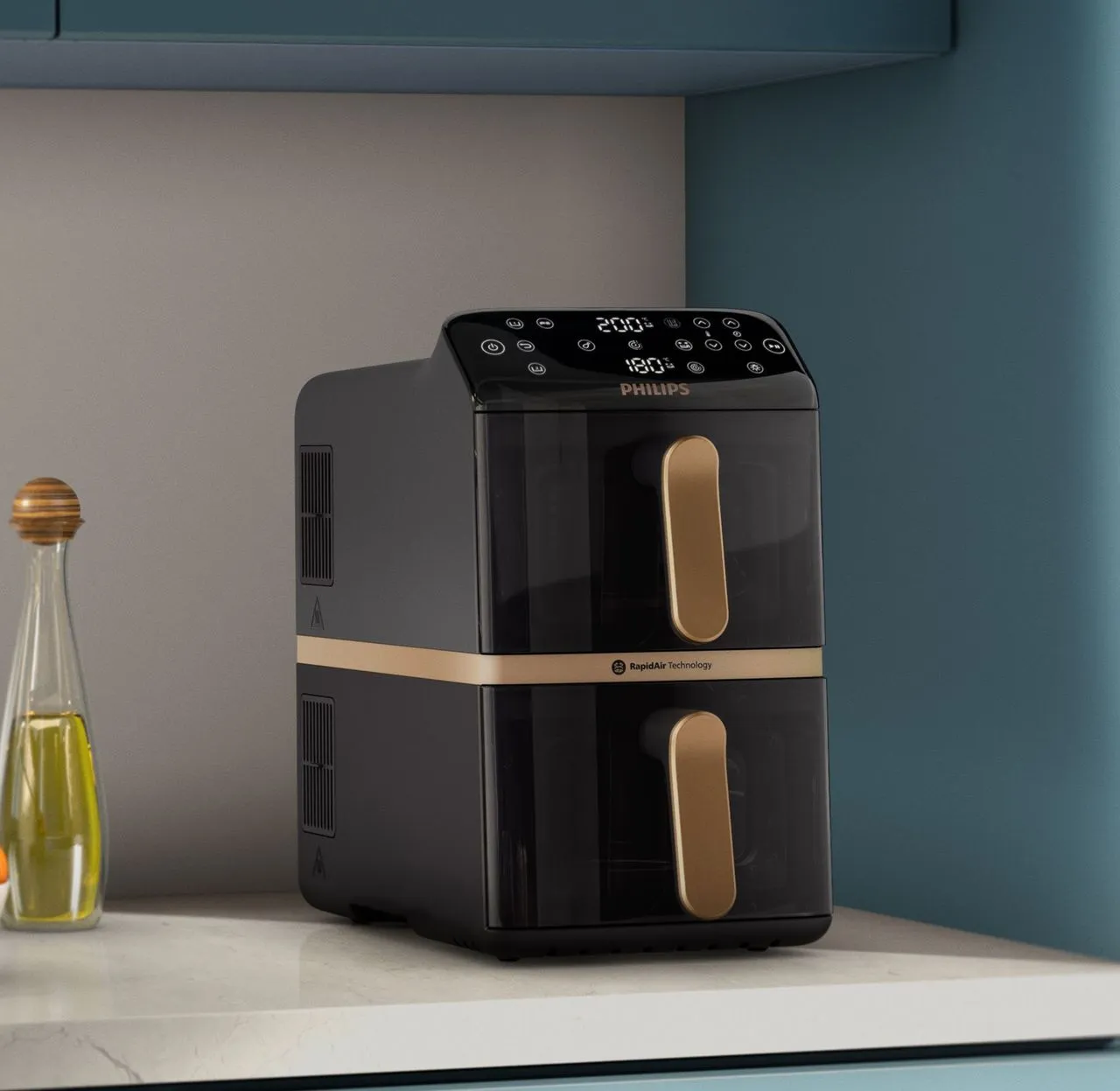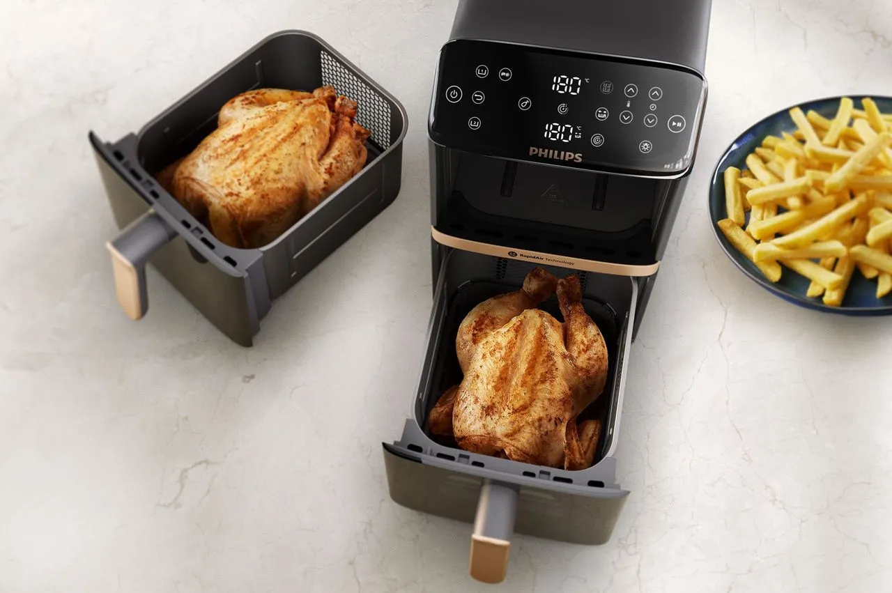 Philips tar nu klivet in i segmentet för staplade airfryers med dubbla korgar. Med 10 liters total kapacitet, synkroniserad tillagning, insynsfönster och appkoppling riktar sig modellen till hushåll som vill laga mycket mat – utan att ge upp onödigt mycket bänkyta.
