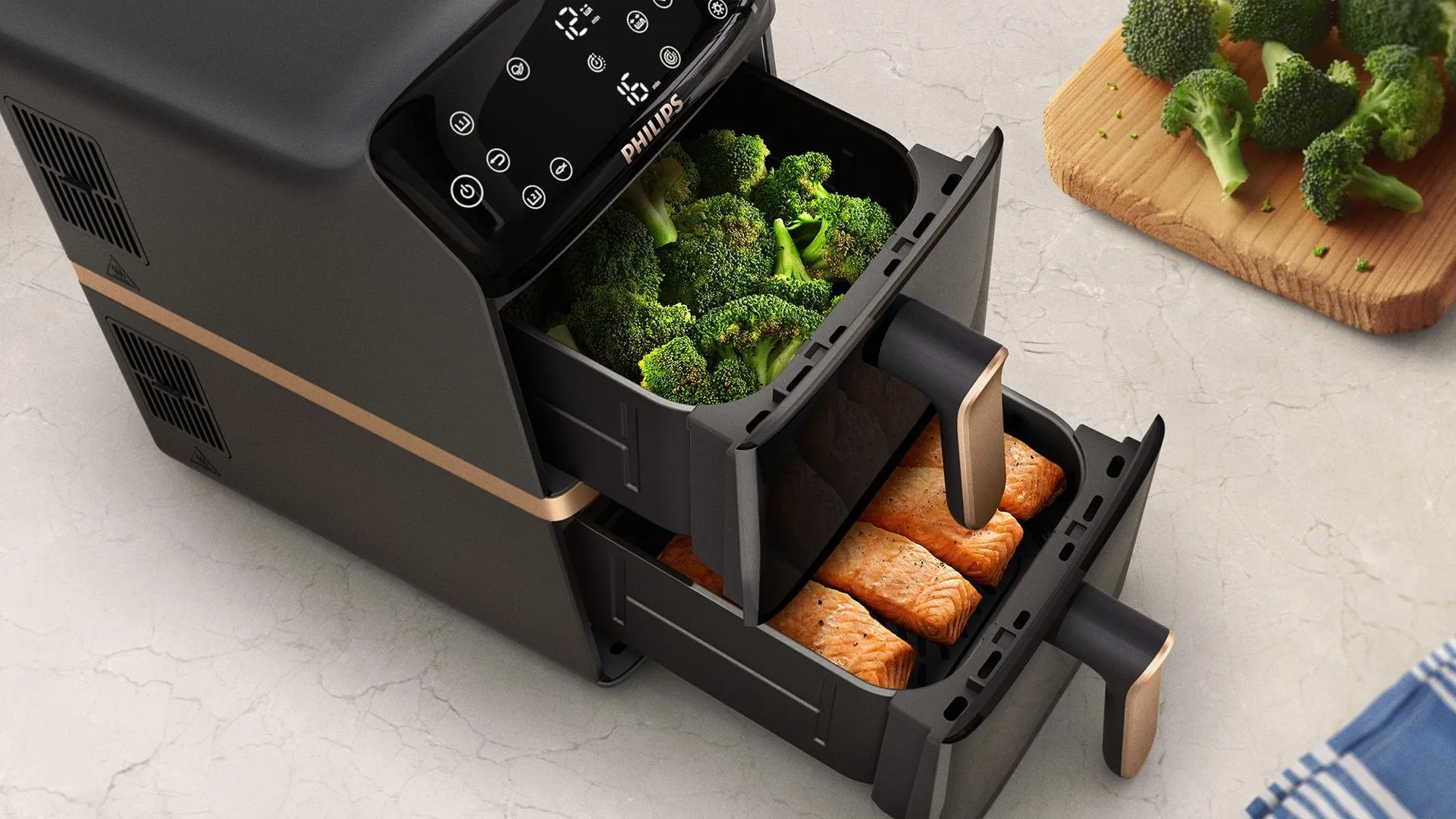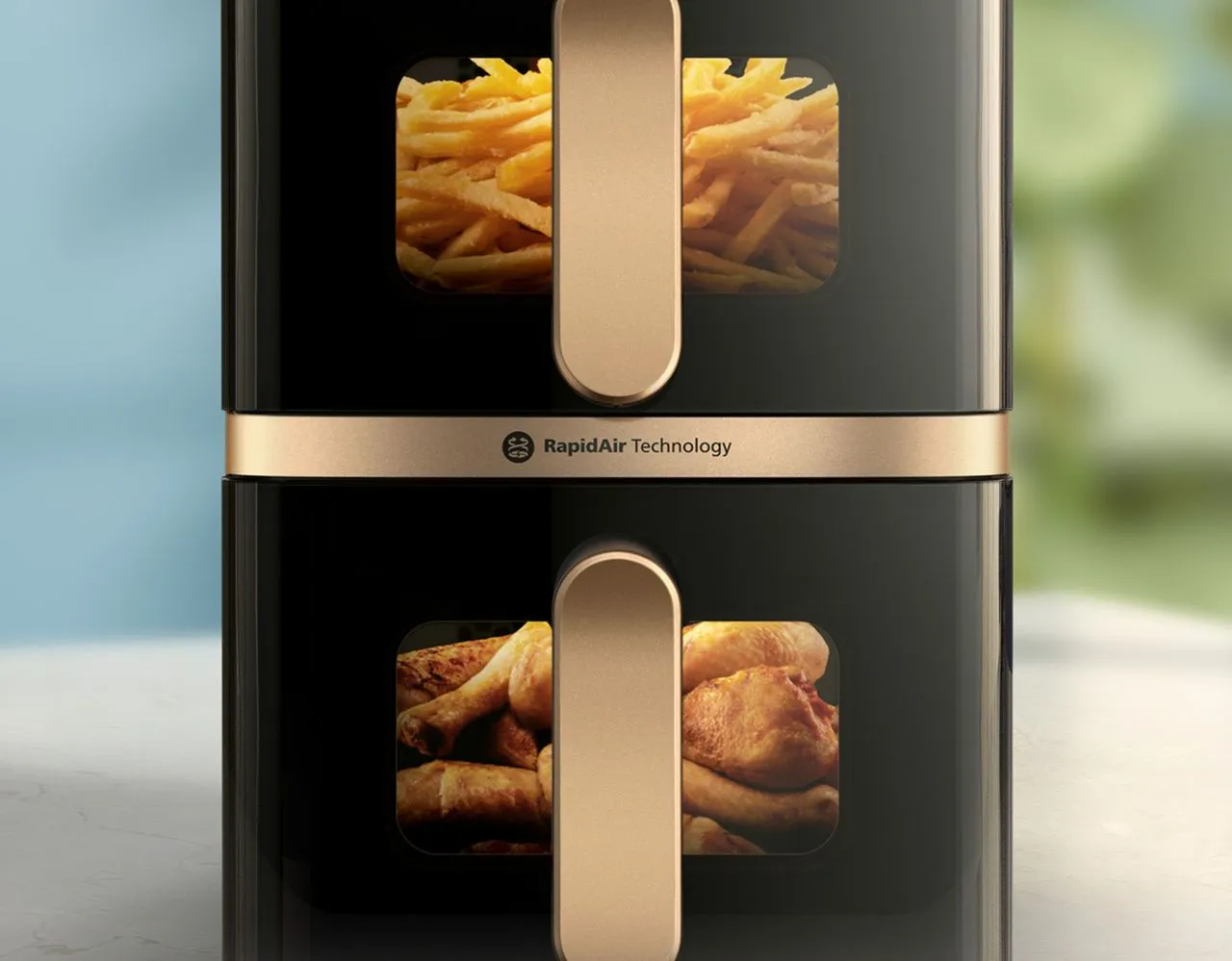 Men ju större hushåll, desto större maskin – och desto mer bänkyta försvinner. Nu presenterar Philips en ny lösning: en airfryer med dubbla korgar som är staplade på höjden istället för placerade bredvid varandra.