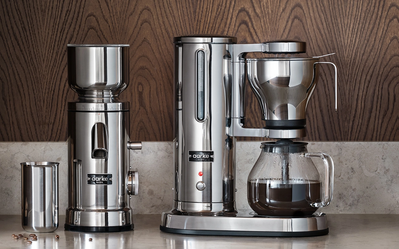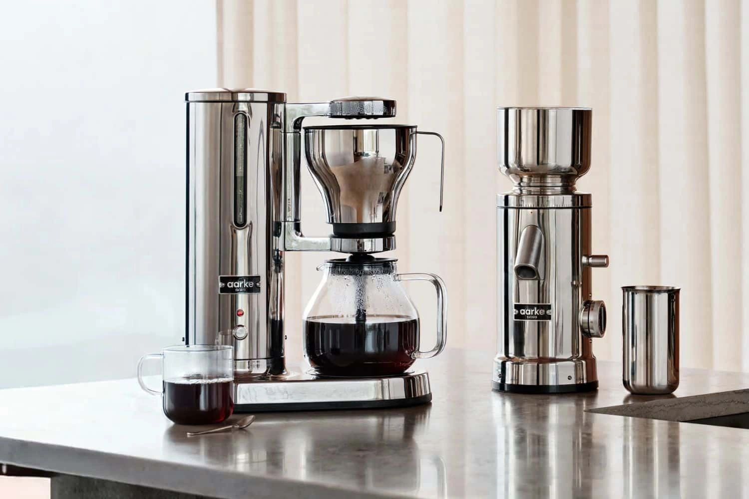 Aarke Coffee System består av två centrala enheter: en precisionskvarn och en kaffebryggare. Vid en första anblick är det tydligt att Aarke inte har kompromissat med estetiken. Enheterna är konstruerade i högglanspolerat rostfritt stål och pressgjuten aluminium, vilket ger dem en tyngd och kvalitetskänsla som särskiljer dem från marknadens plastigare alternativ.