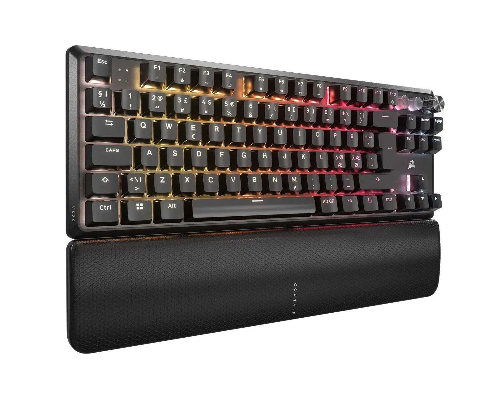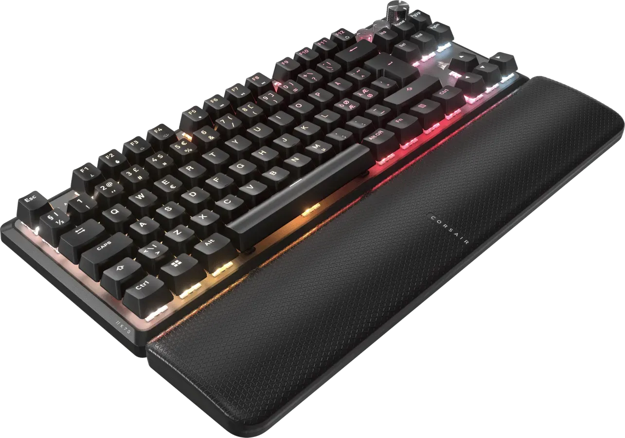 Istället för dedikerade medieknappar längs hela ovankanten har Corsair valt en mer strömlinjeformad lösning. Här återfinns ett taktilt rullhjul för volymkontroll, likt det vi sett på fullstora K70 Core, samt knappar för att aktivera ”Game Mode” och styra media. Game Mode-knappen är särskilt användbar då den omedelbart växlar till en mer responsiv profil och låser belysningen till ett statiskt sken för att minimera distraktioner.