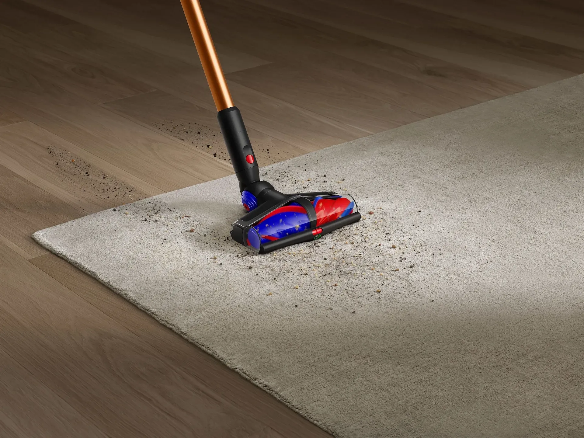 Trots en vikt på 3,5 kg upplevs maskinen förvånansvärt balanserad. Dyson har integrerat en vadderad sektion ovanför greppet, vilket avlastar handen vid längre städpass. Med en höjd på nästan 130 cm är det en maskin som tar plats i hemmet, men tack vare den nya finishen känns den mer som en modern inredningsdetalj än ett traditionellt städredskap.