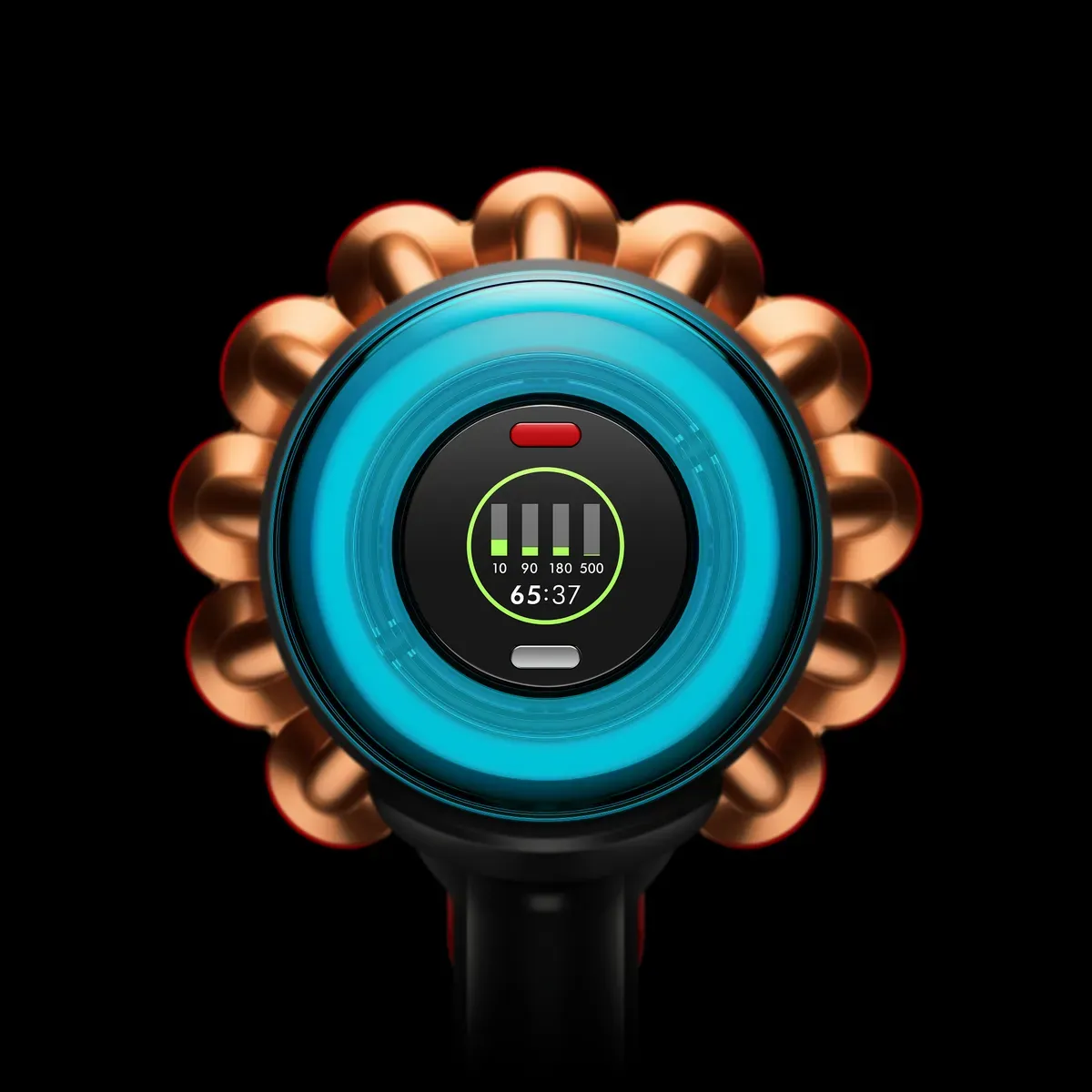 Displayen på bakstycket har uppdaterats med ett nytt färgkodat system. Istället för enbart komplexa partikelstaplar används nu en intuitiv trafikljuslogik (grönt, gult, rött) för att indikera hur rent golvet faktiskt är. Maskinen är även kompatibel med appen My Dyson, där användaren kan justera inställningar för laser och autoläge. App-integrationen känns dock mer som en teknisk gimmick än ett faktiskt mervärde i vardagen.